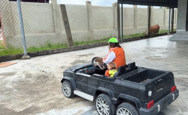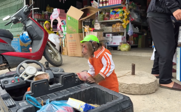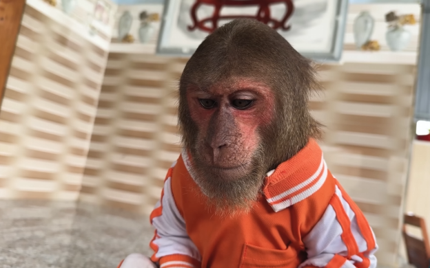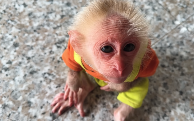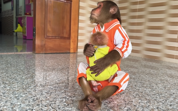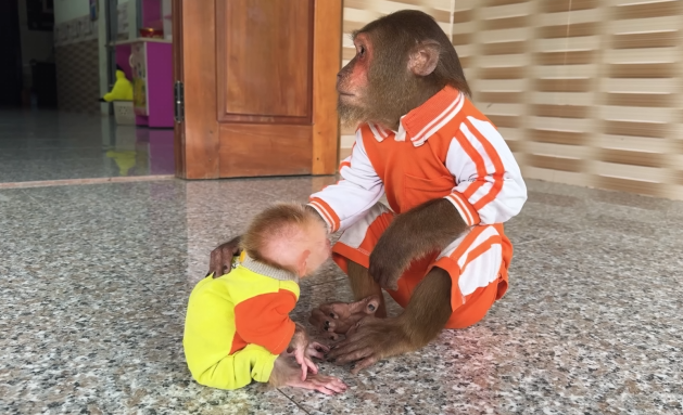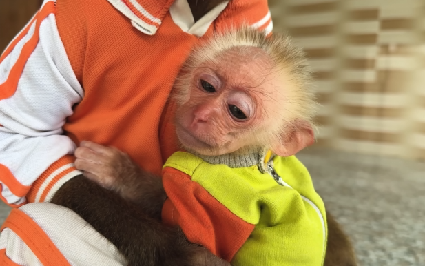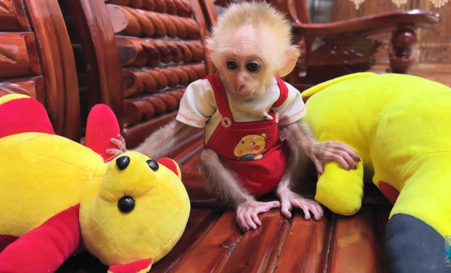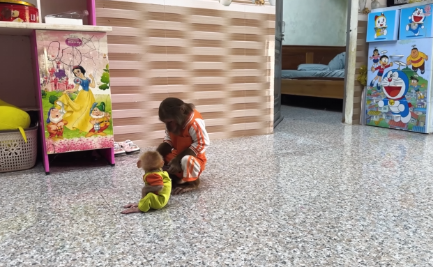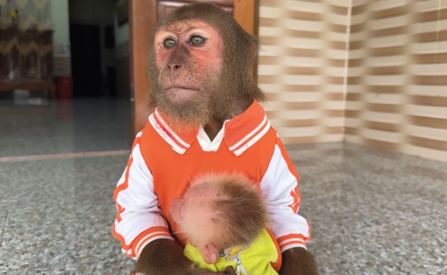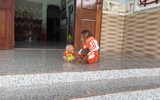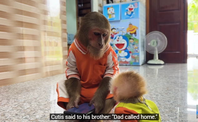 The baby monkey squeaked proudly as if agreeing wholeheartedly. He climbed onto CUTIS’s shoulder, peeking down at the baby with a protective stance.