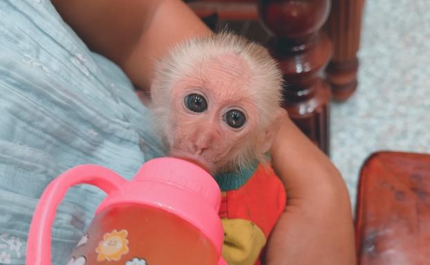 The baby monkey, noticing CUTIS’s teary eyes, made a soft sound — almost like a giggle. He too reached out again, this time brushing the baby’s tiny foot that peeked out from under the blanket. The newborn stirred, wiggling gently, and the monkey’s face lit up with delight. He clapped his hands together in excitement, bouncing slightly on Dad’s lap.