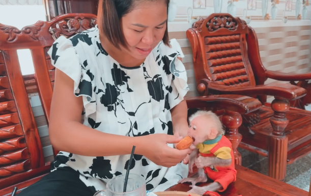 The baby monkey leaned forward curiously, his round eyes blinking rapidly. He tilted his head left and right as if trying to figure out what this tiny creature was. Then, with a cautious step, he leapt closer, crawling onto Dad’s lap to peek at the bundle.
