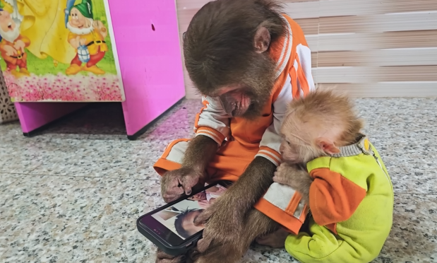 The baby monkey, braver in his curiosity, stretched out a finger and brushed against the baby’s blanket. His face lit up with wonder, as though he had discovered a secret treasure. He chirped softly, looking up at CUTIS as if saying, Come closer, don’t be afraid.