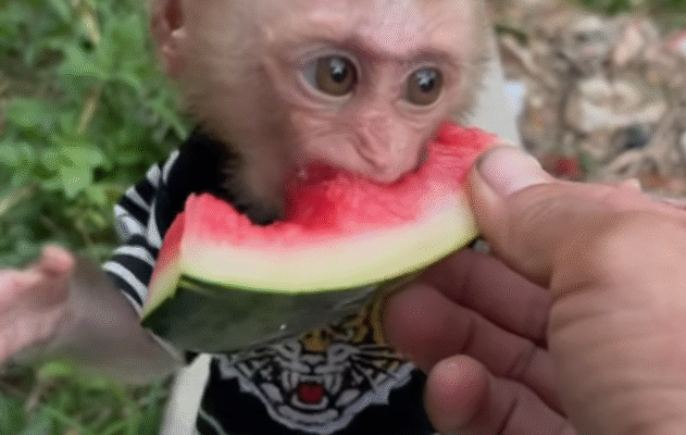 On that hot summer’s day, the baby monkey turned a simple melon into a festival of joy. From the first greedy bite to the messy chin, from the protective cuddling of his slice to the sharing of a tiny piece, every moment was filled with laughter.
