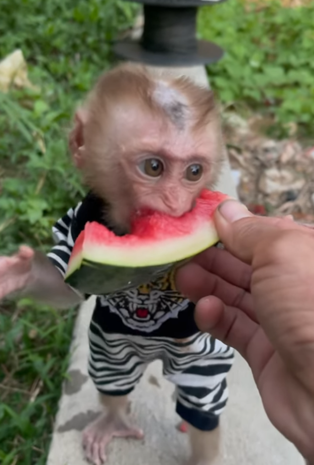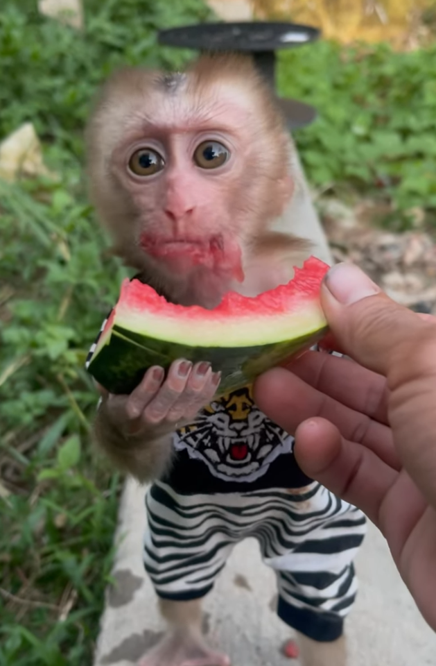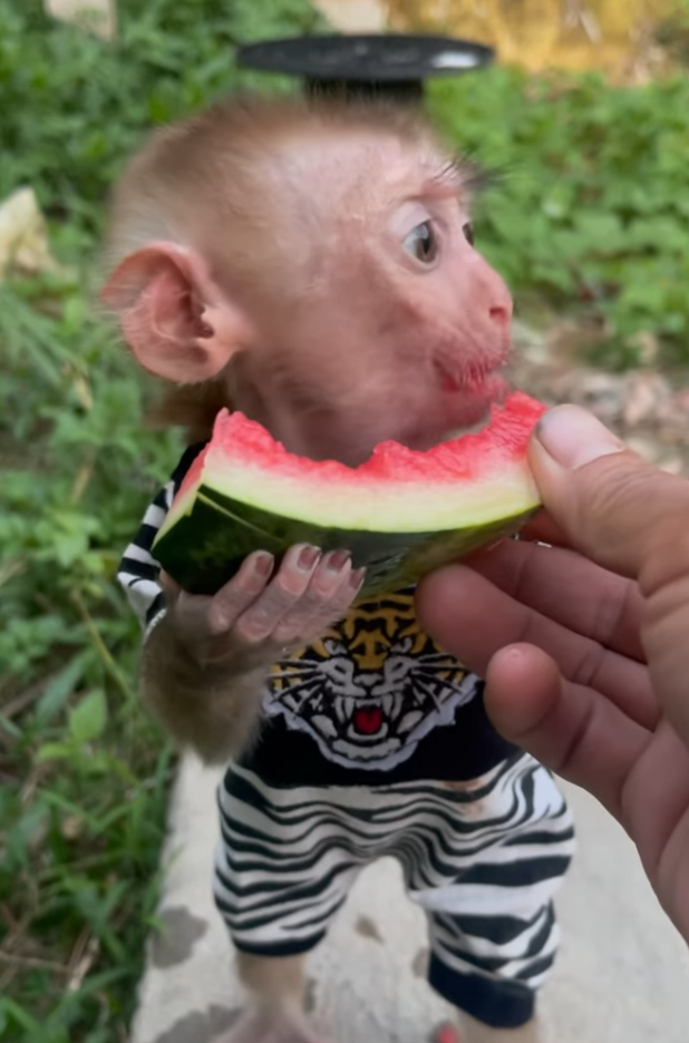 The baby monkey sat down, legs stretched out, and began nibbling at the melon. His small teeth sank into the juicy fruit, and the juice ran down his chin. He didn’t mind at all—in fact, he licked every drop that spilled, determined not to waste a single bit.
