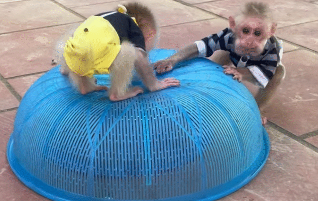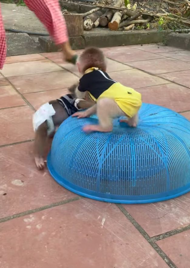 After such a busy day, Mom decided the monkeys needed a wash. She filled a small basin with warm water and called them over. But instead of obediently stepping in, they both tried to escape.