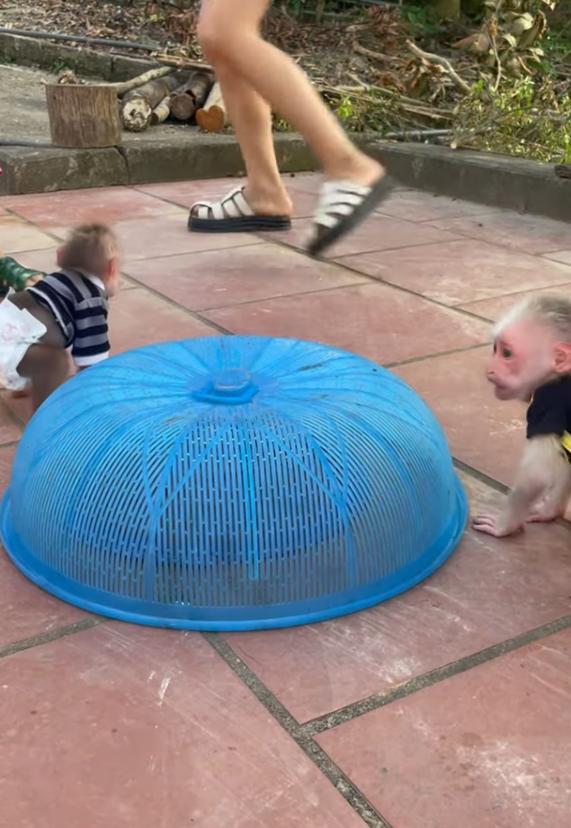 While Mom napped with the newborn, the monkeys decided to play âpeek-a-boo.â One monkey tiptoed to the babyâs cradle, covering his own face with his little hands. When he peeked out suddenly, the baby let out a surprised gasp before breaking into giggles.