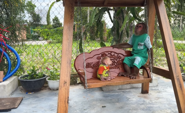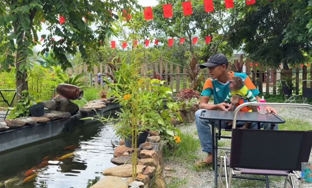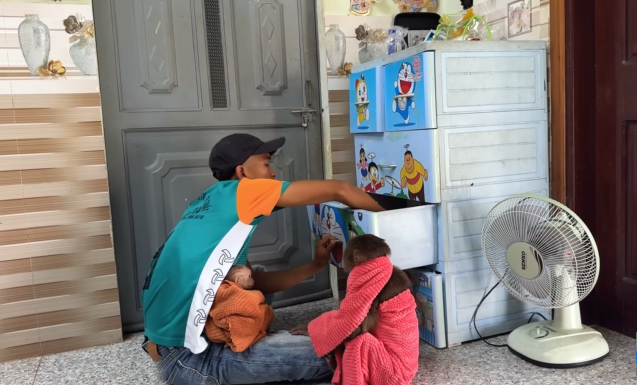 As they ate, CUTIS and the monkey decided to try out their new toy kitchen. They placed the wooden fruits into the tiny pans and stirred with serious expressions, pretending to be master chefs.