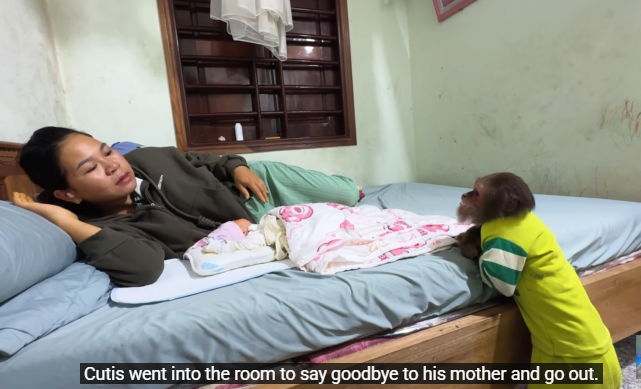 The morning sun peeked through the curtains, filling the house with a golden glow. CUTIS, with his fluffy hair sticking up from sleep, rubbed his eyes and glanced over to the bed where his best little friend, the baby monkey, was curled up. The monkey stretched, yawned, and then immediately started climbing onto CUTIS’s shoulders as if to say, “Wake up, it’s time for fun!”