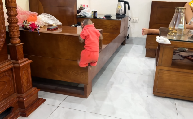 Lala tiptoed over to Dad’s side of the bed. She climbed up carefully, her little feet sinking into the mattress as if it were a fluffy trampoline. Leaning close to his ear, she whispered, “Daaad, time to wake up. Let’s play!”