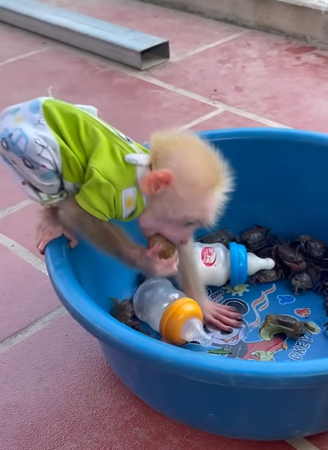 Coco was still busy digging in the wet sand, unaware of the furry shadow creeping closer. With quick little hands, Momo snatched a bundle of seaweed and popped a clam into his mouth.