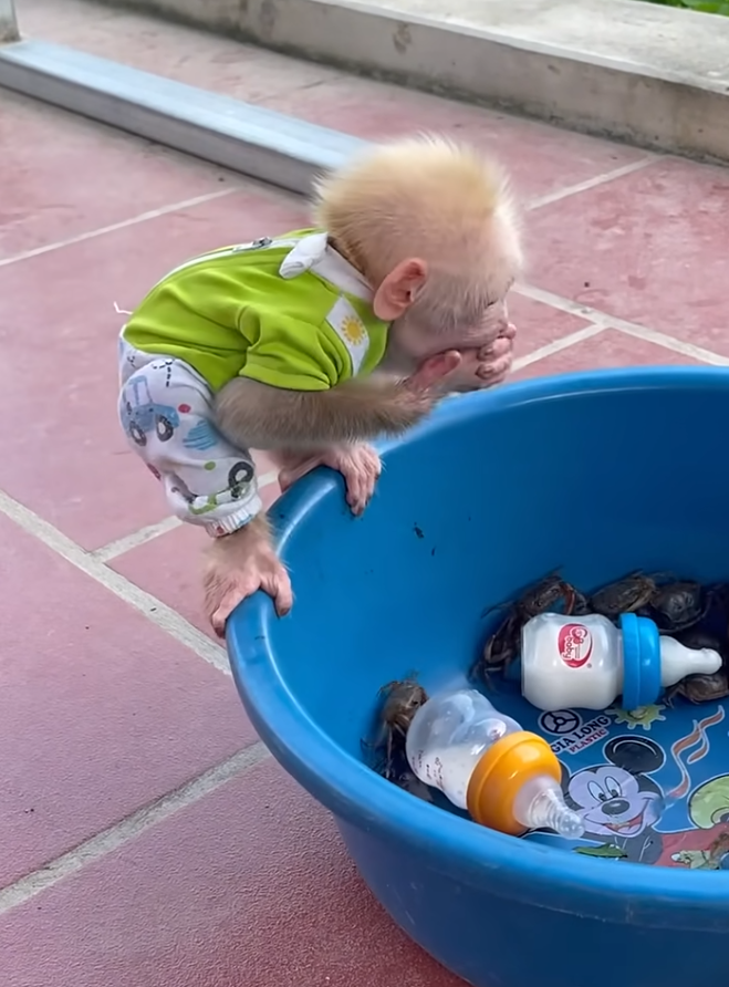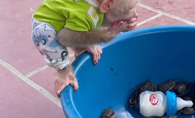 The sound made Coco whip her head around. Her eyes widened. “Oh no! The monkey stole the crab’s food!” she cried, waving her claws in alarm.