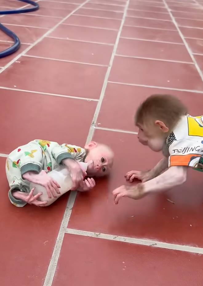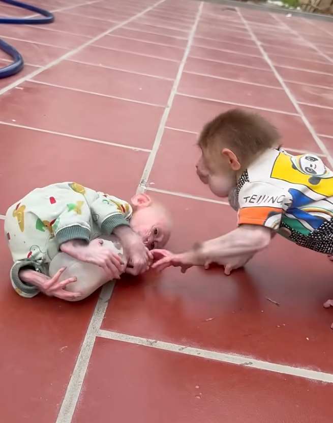 The tension melted away as the two baby monkeys began their familiar game: passing the bottle back and forth, each taking turns to drink. Their earlier quarrel seemed forgotten, replaced with giggles and playful squeaks. At one point, Bibi even held the bottle steady for Lala while she drank, as if to make up for knocking her down earlier.