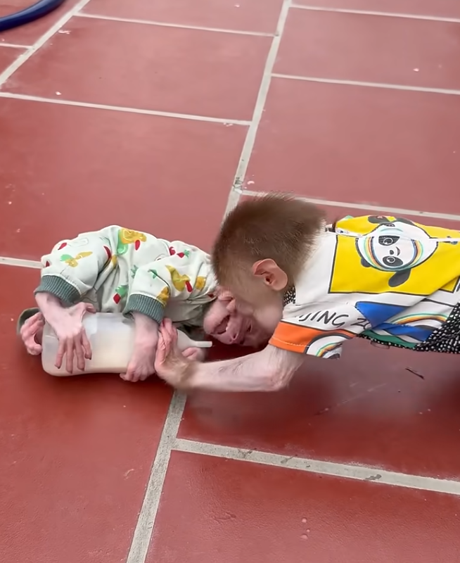 Bibi, however, wasn’t in the mood for laughter. She wanted more milk, and she wanted it now. First, she tried gentle persuasion. She tugged lightly on Lala’s arm, squeaked sweetly, and pointed at the bottle with hopeful eyes. But Lala shook her head again, clutching the bottle tighter.