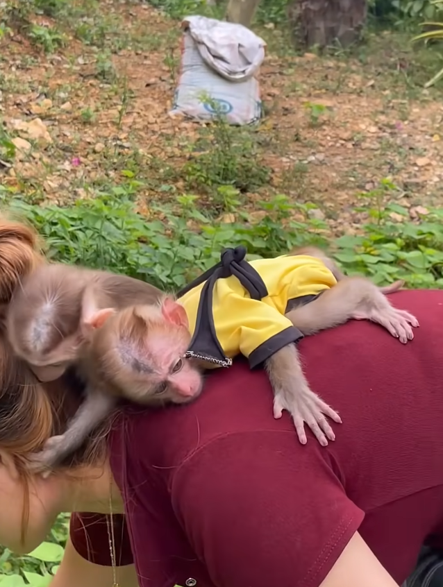 The baby monkey’s eyes fluttered shut, his tiny hand clutching his mother’s fur. The garden’s breeze rustled the leaves above them, carrying with it the promise of many more adventures to come.