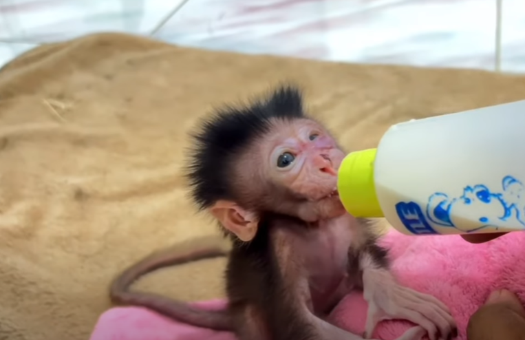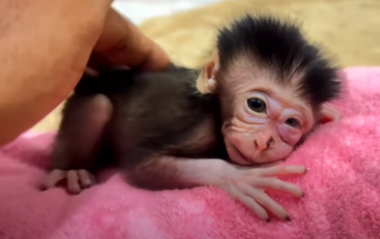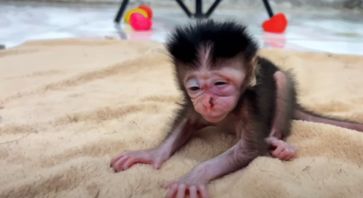 The jungle was quiet that evening, except for the rustling of leaves and the faint songs of crickets echoing under the moonlight. In a small rescue center at the edge of the forest, a tiny baby monkey lay curled up in a soft blanket, his big brown eyes shimmering with sadness. He had been rescued only hours earlier—found clinging desperately to a tree branch after his mother had disappeared.