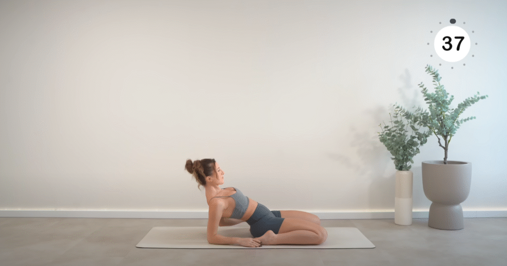 - How to Do It: Lie on your side, bend your top knee, and grab your ankle to pull it gently toward your glutes. Keep hips stacked and core engaged. Switch sides.