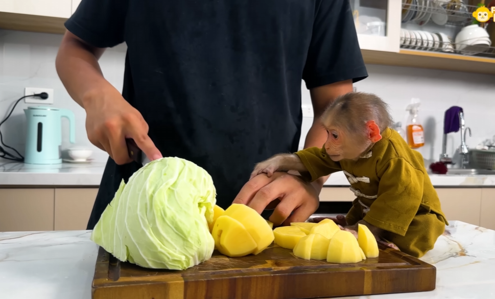 The afternoon rolled on with more cooking experiments—Lala tried stirring soup in her “tiny saucepan,” and Dad chopped vegetables with his new knives. They made noodles, fried eggs, and even boiled corn. The house was filled with delicious smells and happy chatter.