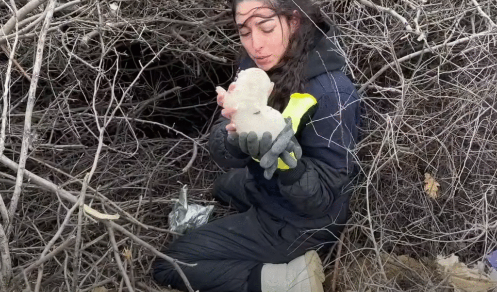 An hour later, headlights cut through the rain. A van pulled up, and two rescuers stepped out — women with calm voices and warm towels. They approached slowly, crouching so as not to frighten the mother.