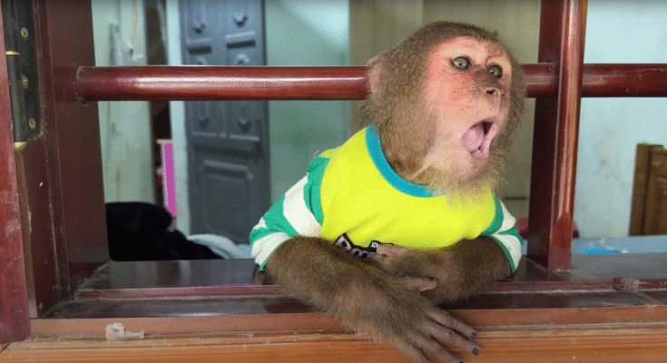 While leaning in too far from the tree branch, CUTIS slipped and tumbled down with a dramatic âOof!â landing right in front of Dad and the baby monkey.