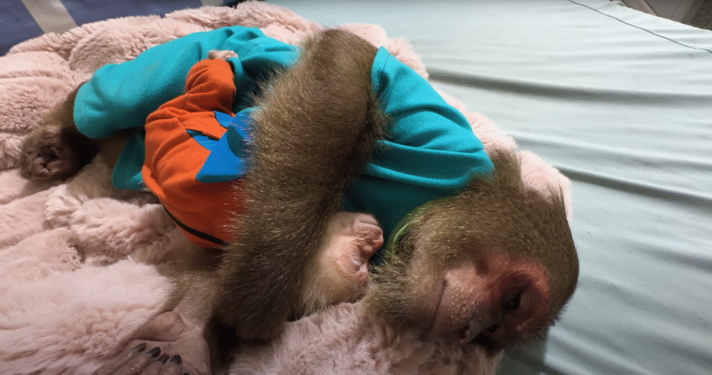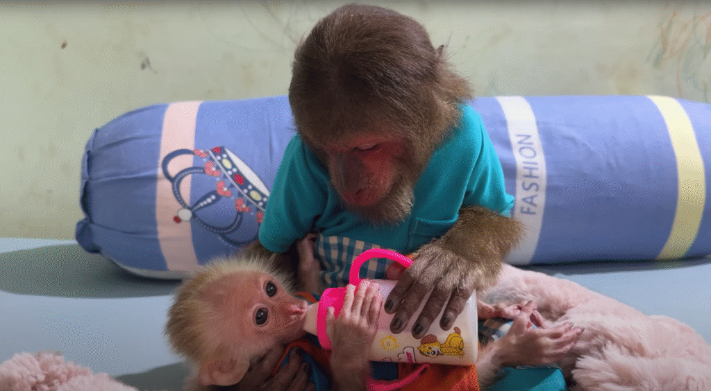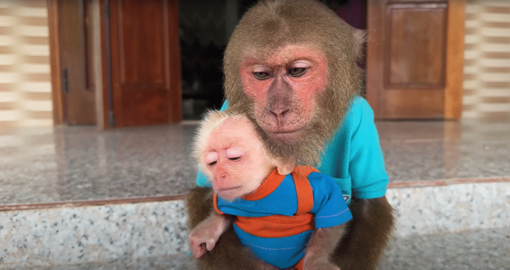 The baby monkey yawned, his small hand resting gently on the newborn’s head. “Family,” he mumbled before closing his eyes.
