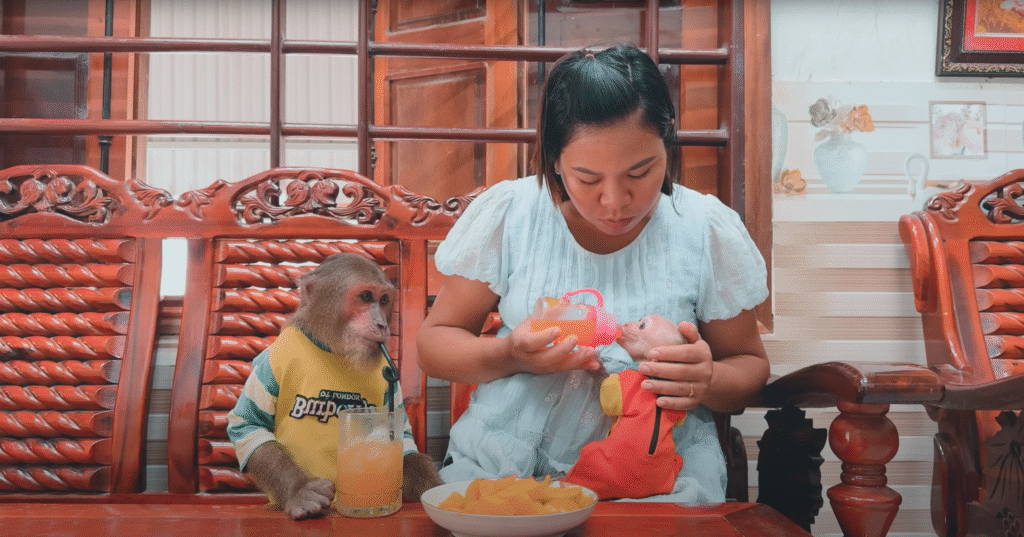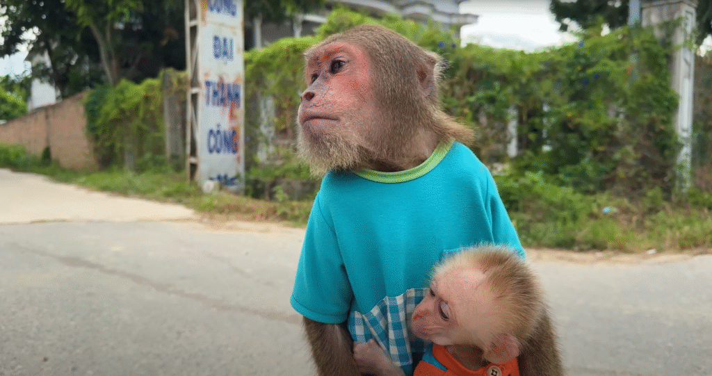 The baby monkey squealed in fear, running to her and holding her arm. His tiny body shook as he whimpered, “Mom, no… don’t!”