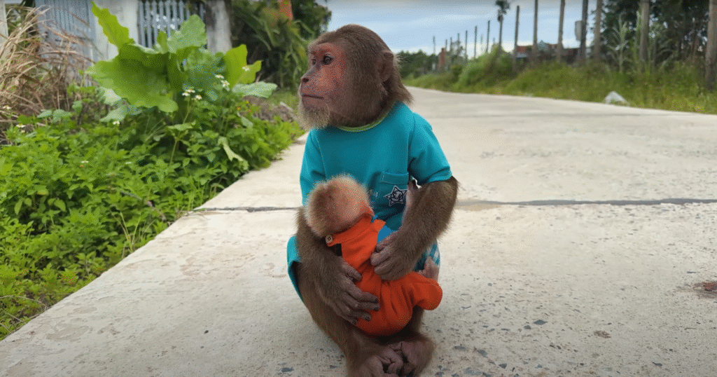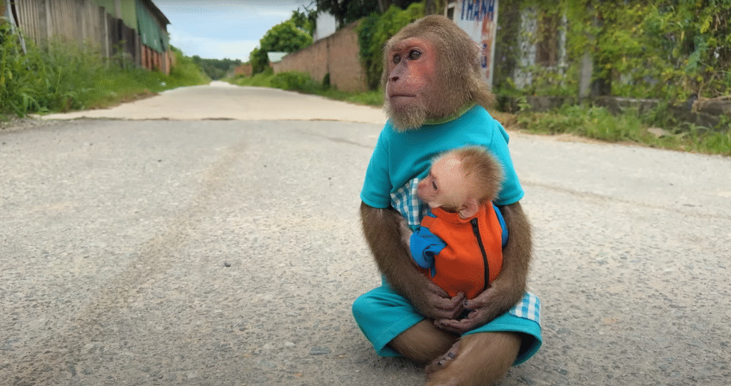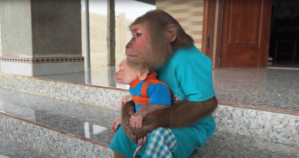 Mom had been slower and quieter than usual for days. Her belly had grown rounder, and she often paused to rest, her hand gently rubbing the life inside her. CUTIS, sharp-eyed and sensitive, noticed her every move. The baby monkey, though younger and less understanding, mirrored his brother’s concern with wide, curious eyes.