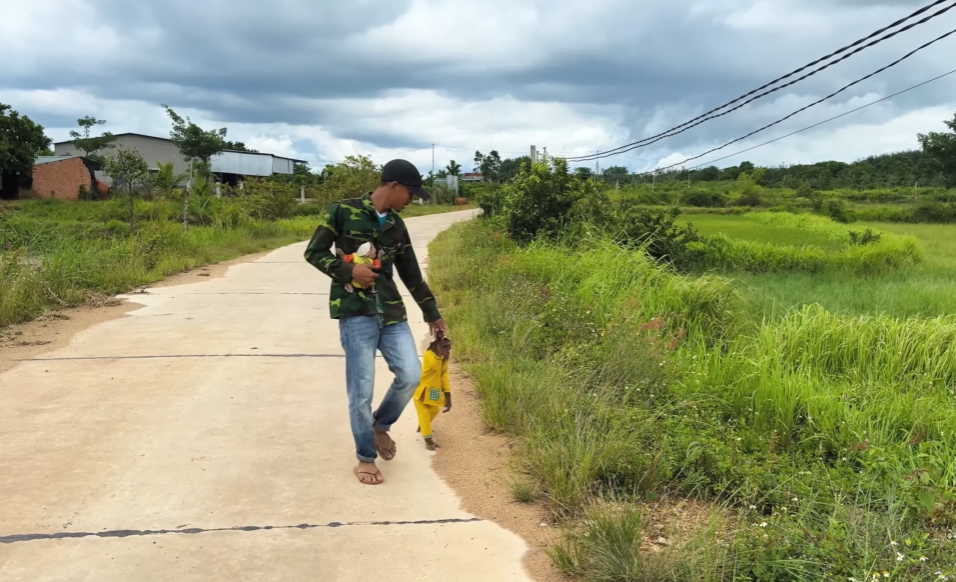 They walked together down the dirt path, the sounds of roosters crowing and birds chirping filling the air. Baby Monkey, who never wanted to miss out on any adventure, skipped behind them. He carried a tiny cloth bag across his shoulder, pretending it was just like Dad’s big farm satchel.