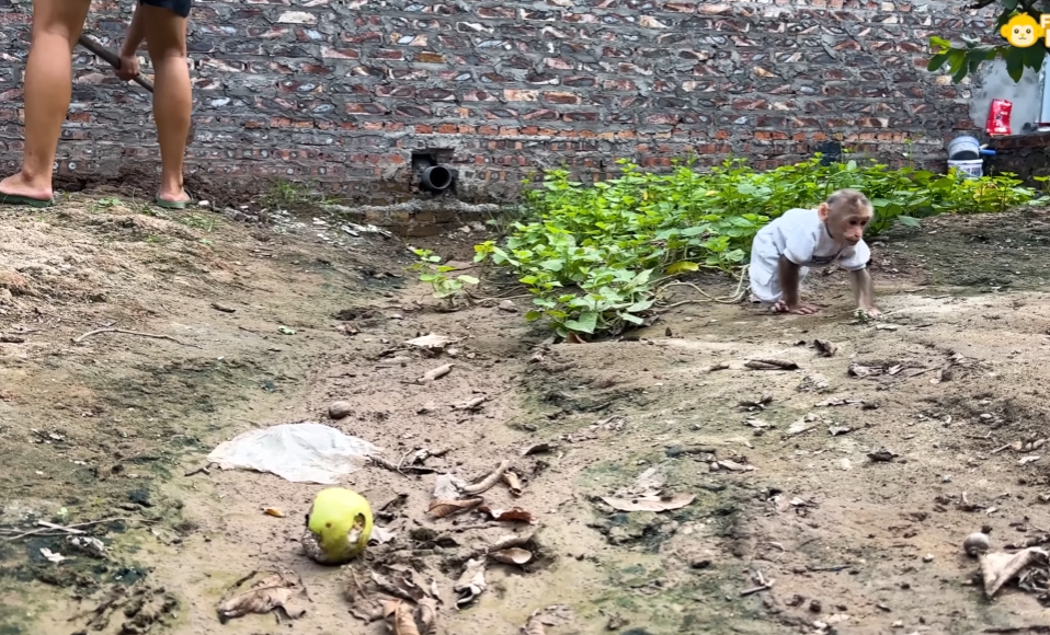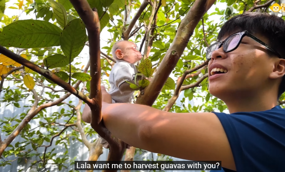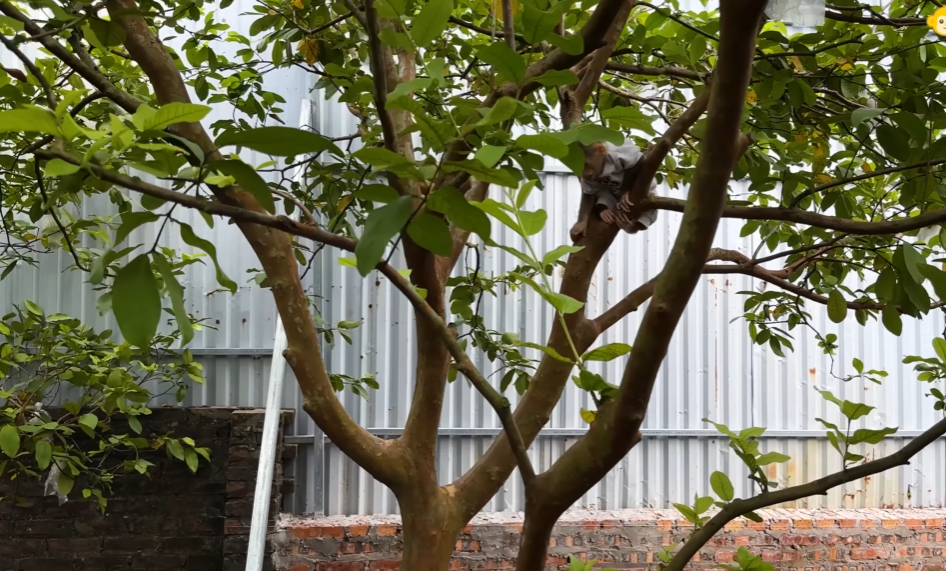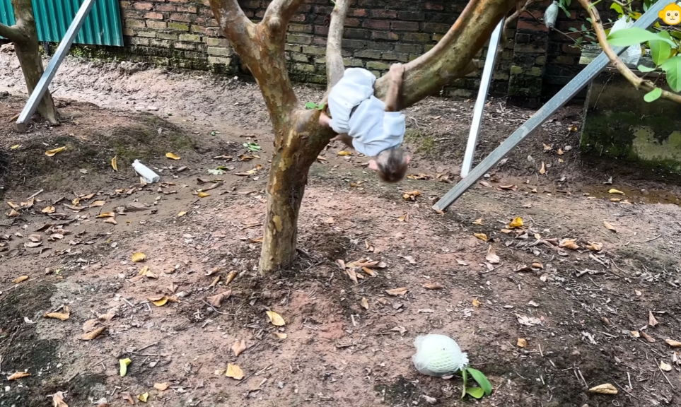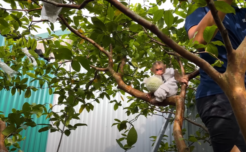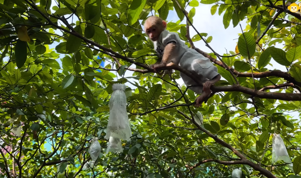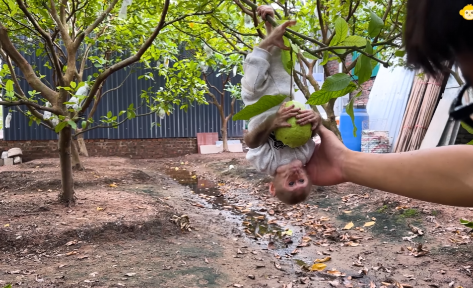 Baby Monkey didn’t want to be left behind. He scampered up the lower branches, reaching for a guava of his own. But instead of twisting gently, he tugged and pulled until the fruit dropped straight on his head with a thud!