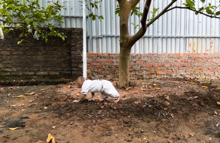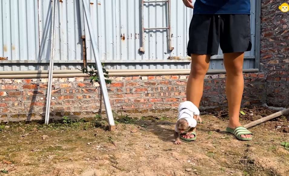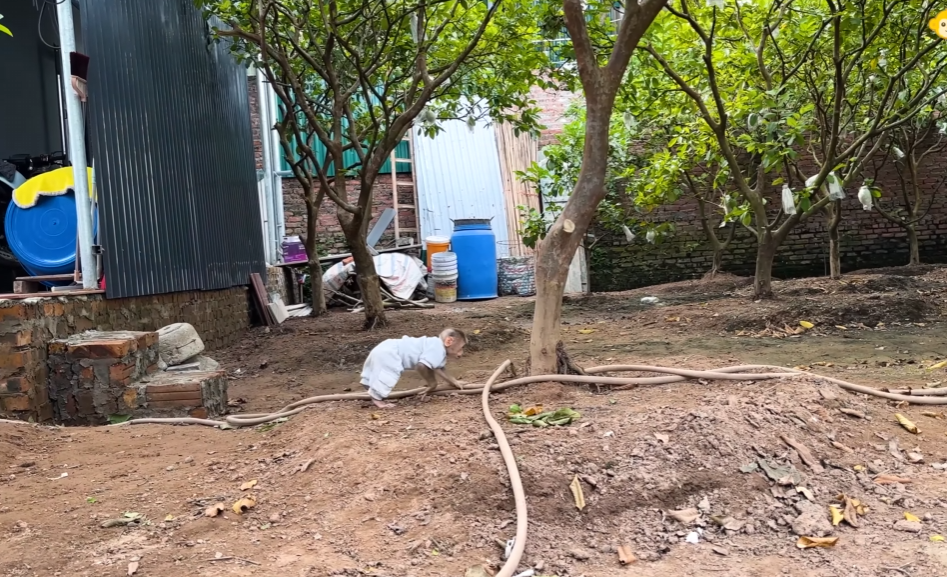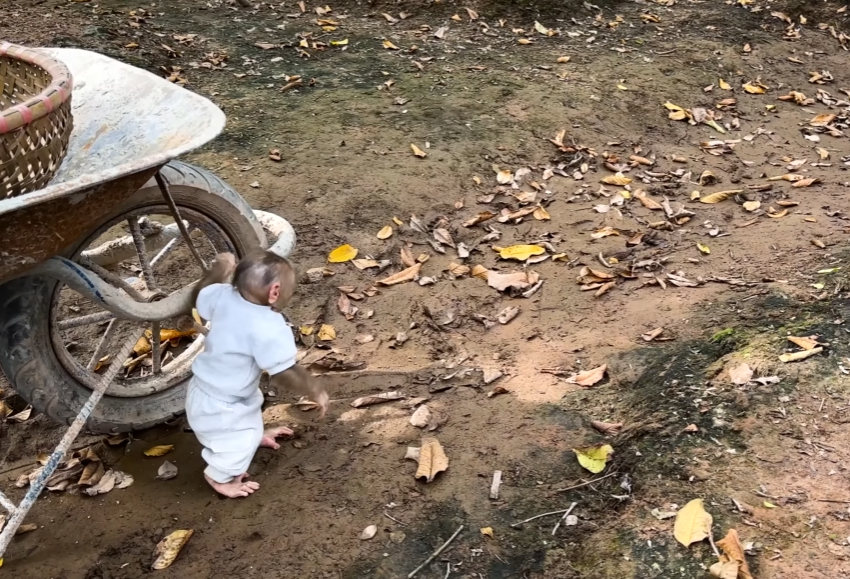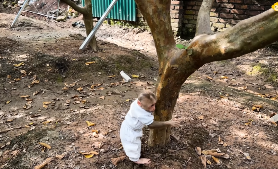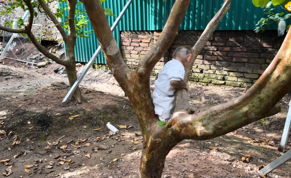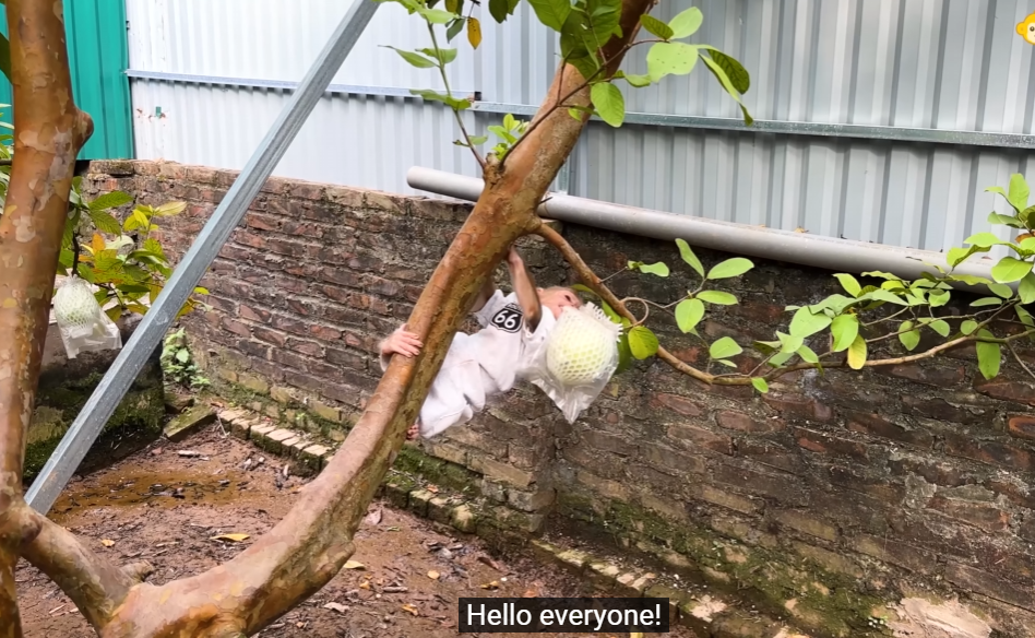 Baby Monkey didn’t want to be left behind. He scampered up the lower branches, reaching for a guava of his own. But instead of twisting gently, he tugged and pulled until the fruit dropped straight on his head with a thud!