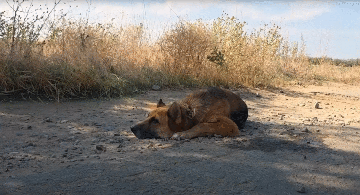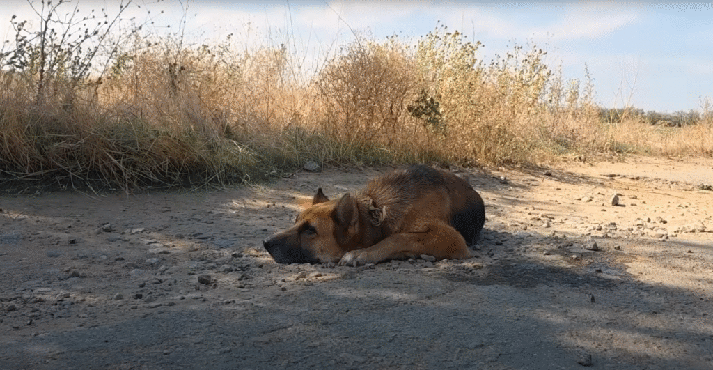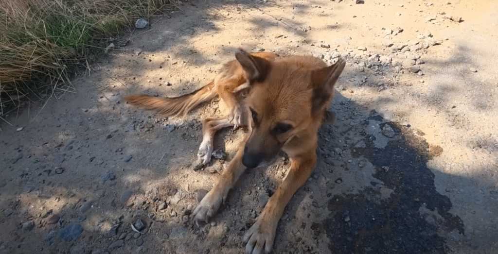 After days of wandering, exhaustion overtook her. The sun beat down harshly, and her tongue hung dry from her mouth. Her legs buckled, and with a faint whimper, she collapsed onto the side of the road. Dust clung to her fur as her chest rose and fell in shallow breaths.