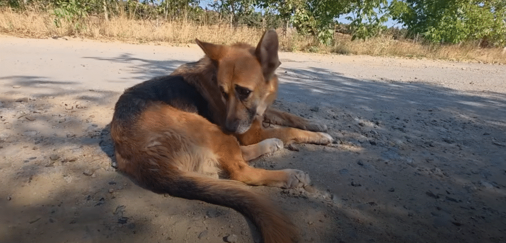 The evening sky glowed with a soft orange hue as an old German Shepherd staggered along the dusty roadside. Her coat, once thick and shining, was now dull and matted. Her legs trembled with every step, her ribs faintly visible beneath her fur. Yet her eyes—tired, sunken, and clouded with age—still held a quiet determination. She was searching. Searching for the only place she had ever known: home.