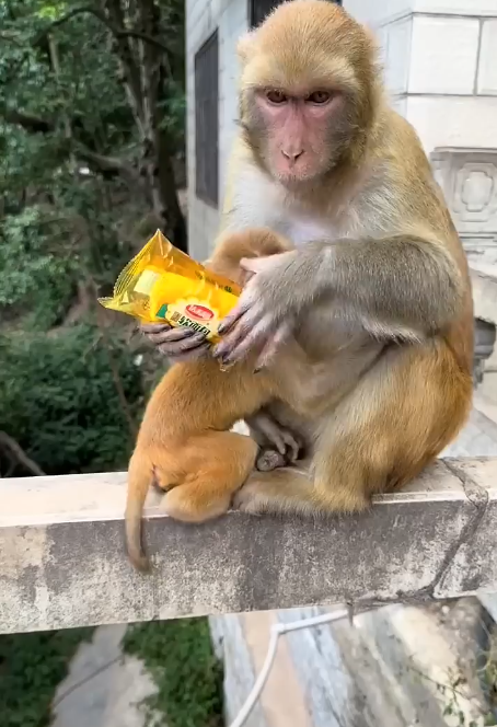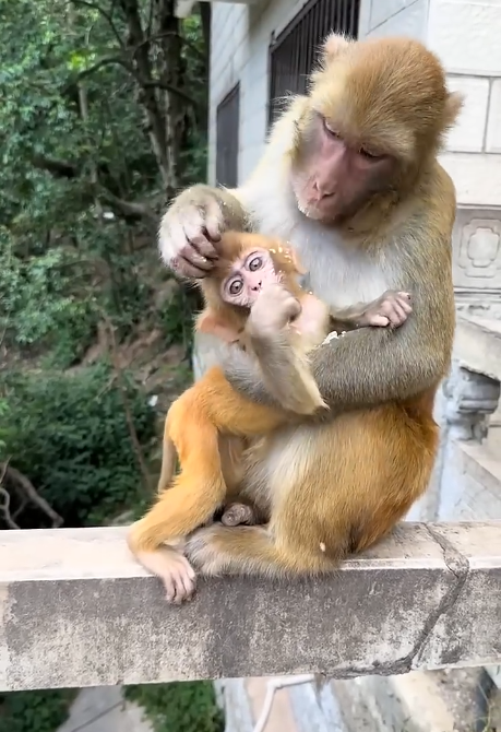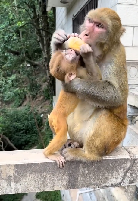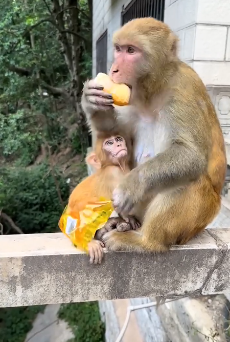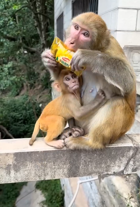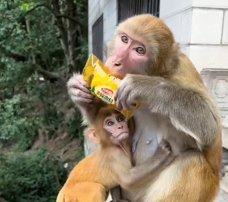 If a dog barked too close, she stood tall, shielding her babies with her arms, glaring until the dog backed away. If other monkeys tried to snatch her food, she shared calmly or pulled her children closer, waiting until the threat passed. Where other animals might screech in fear or lash out wildly, this mother always seemed to carry herself with dignity. That is why people began saying, “This monkey mother is okay monkey. She can handle everything.”