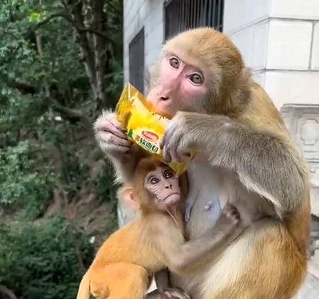 One afternoon, a vendor accidentally dropped a bag of peanuts near the forest edge. Several monkeys rushed at it, screeching and fighting to grab the most. But the mother monkey simply waited, her babies clinging tightly. When the scuffle ended, she quietly picked up what little was left, calmly splitting the peanuts in half for her children.