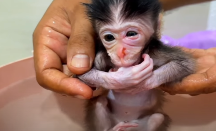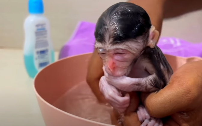 Dad used a soft cloth, dipping it into the water and squeezing it gently over Ciciâs back. He moved slowly, cautious not to overwhelm her. Every drop seemed to weigh heavily on her delicate frame. Unlike playful, energetic baby monkeys who would splash and chatter, Cici was still and quiet, her exhaustion visible in every breath.