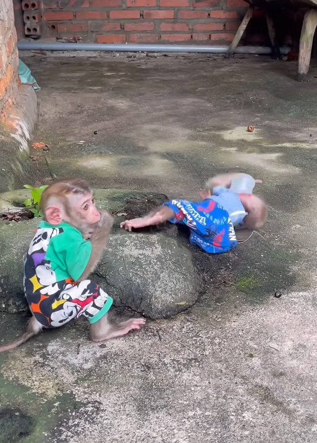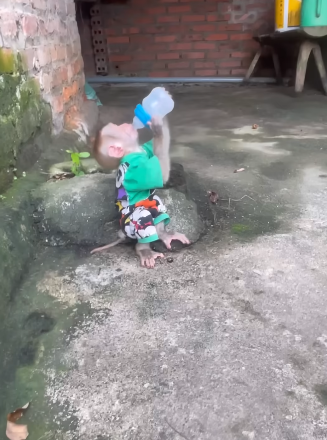 For a brief moment, it worked. Both monkeys sipped quietly, their eyes half-closing in satisfaction. Dad smiled. “See? Easy.”