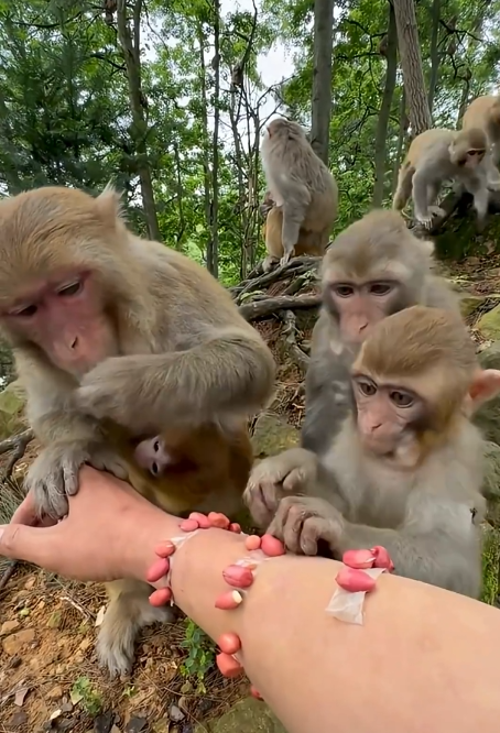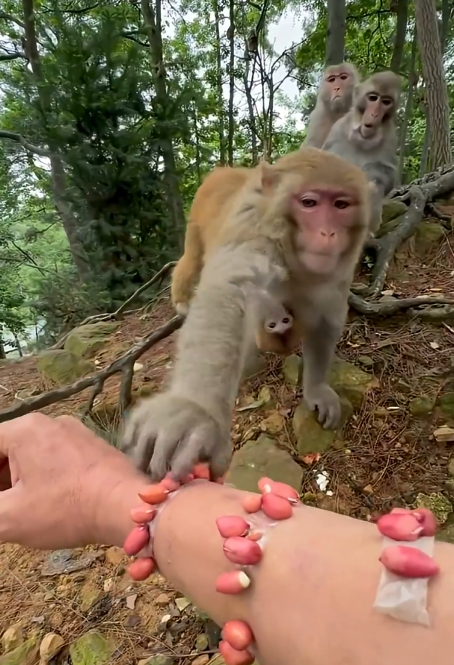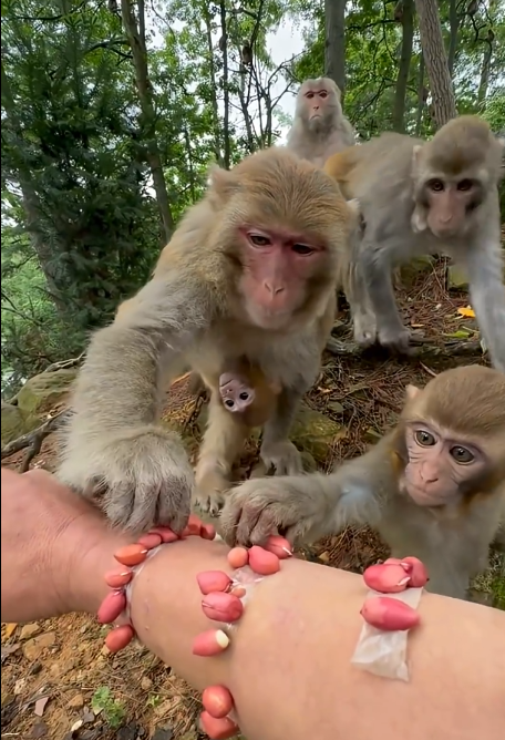- The Floor Disaster: When sticky peanuts fall to the ground, monkeys hesitate. Some gingerly try to pick them up, while others slap, stomp, or rub them to loosen the coating, often ending with even more mess β sticky paws, dirty faces, and laughter-worthy expressions.