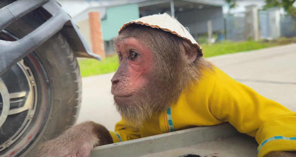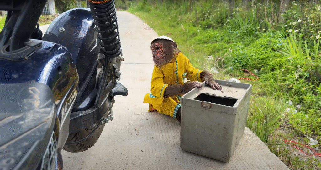 Before anyone could stop him, the baby monkey leapt onto the motorbike seat and started poking around. He lifted the travelersâ bag, sniffed the handlebars, and even tapped the fuel tank as if he were an experienced mechanic.