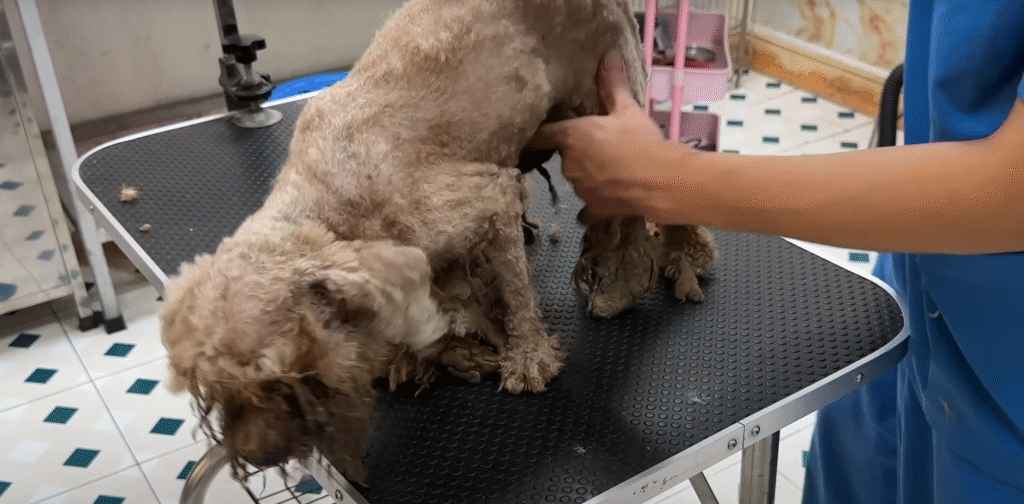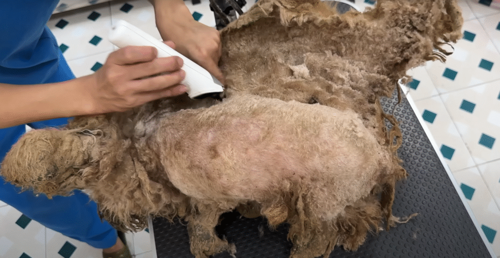 There were moments when the dog whimpered softly, shifting nervously. I spoke to it in a calm, soothing voice, trying to reassure it that we werenât going to hurt it. I scratched behind its ears gently, and it leaned into my hand, a small sign of trust amid the chaos of clippers, scissors, and the constant weight of years of neglect being stripped away.