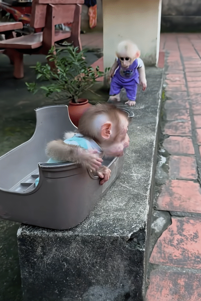 Sumi was a little girl monkey—curious, gentle, and shy. She loved climbing onto small wooden stools and sitting there like a tiny queen, observing everything that happened around her. Kevin, on the other hand, was loud and full of energy. He loved to jump, chase, and wrestle with anything that moved—whether it was a toy, a leaf blown by the wind, or another monkey.