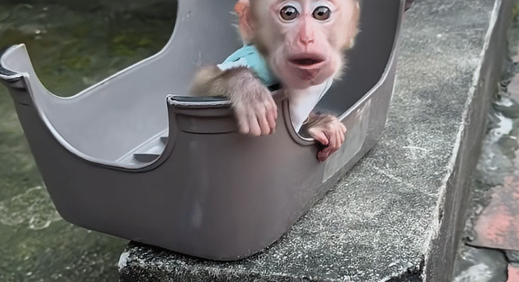 The sun peeked through the tall banana leaves, painting golden streaks across the little courtyard where the baby monkeys liked to play. The morning air was fresh, filled with the smell of damp earth and the faint sweetness of papaya. In this peaceful corner of the world, two baby monkeys, Sumi and Kevin, were growing up together under the watchful care of their human family.