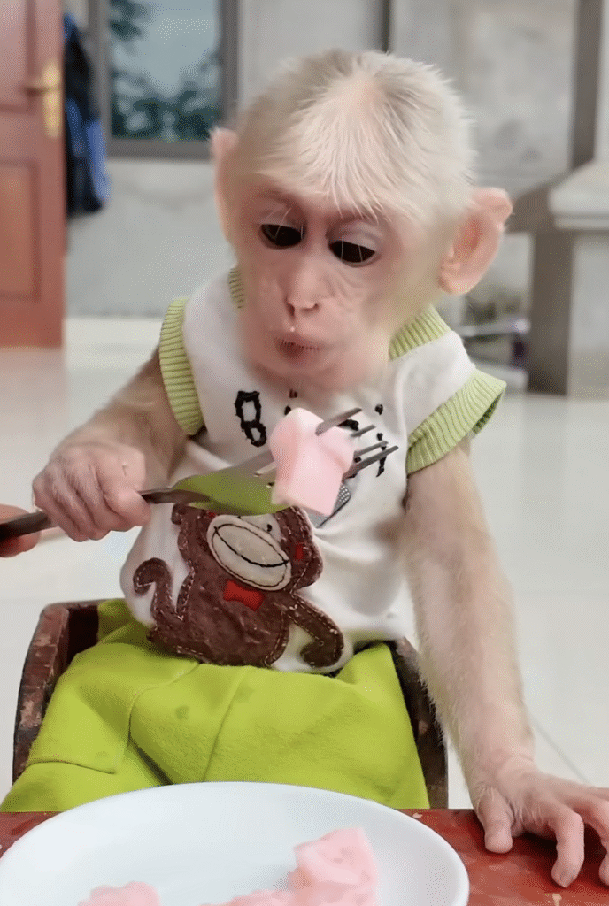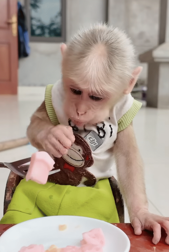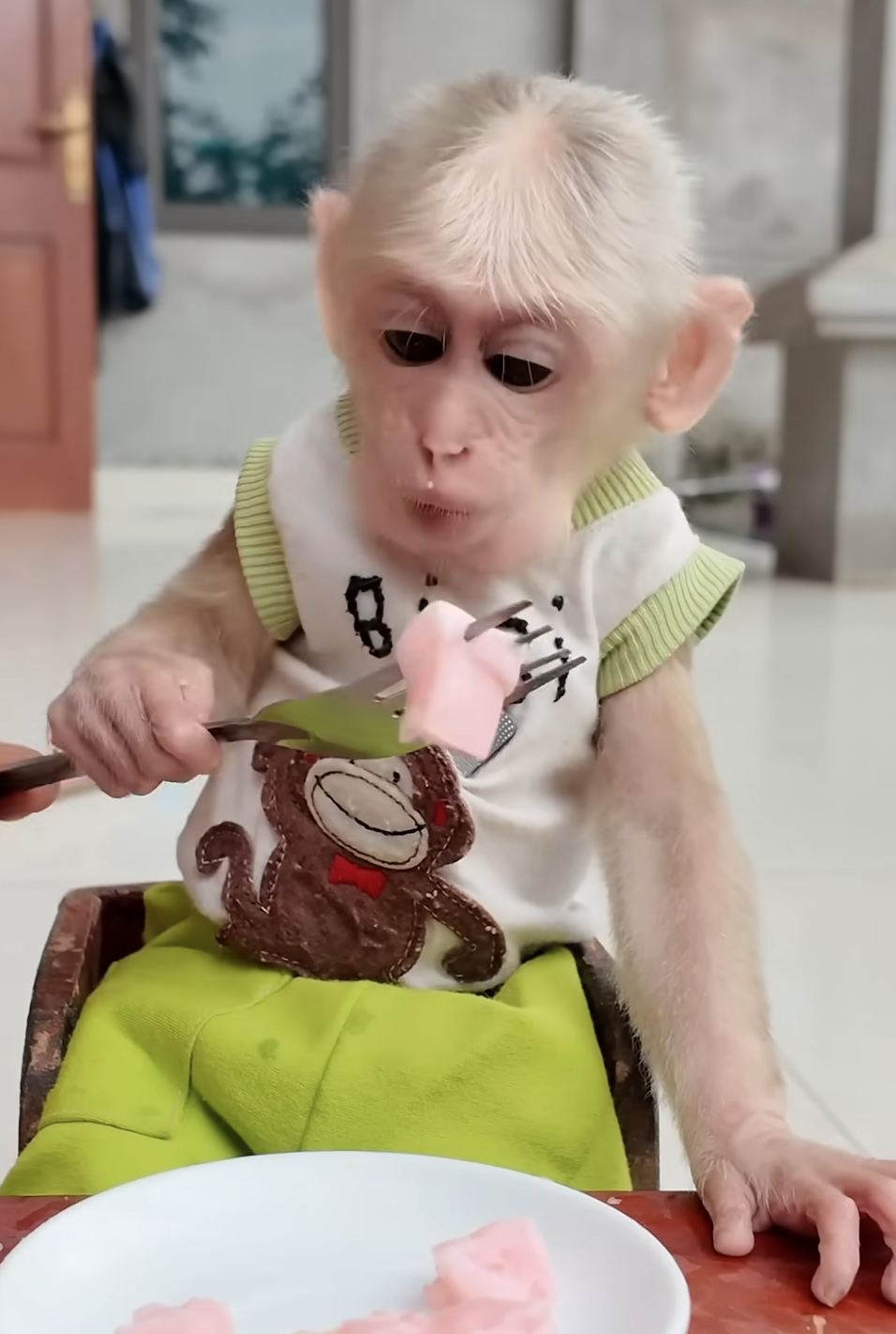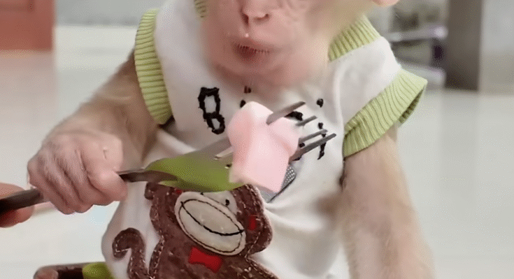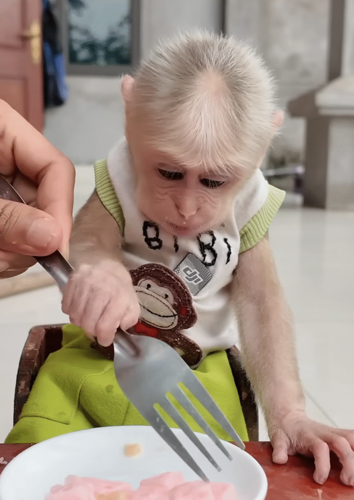 Bibi responded with her usual happy squeak, rushing toward the table where colorful plates were laid out. There were slices of mango, soft bananas, and a bowl of rice. But what caught Bibi’s attention was not the food—it was the shiny little object beside her plate. A small fork, perfectly sized for her tiny hands.