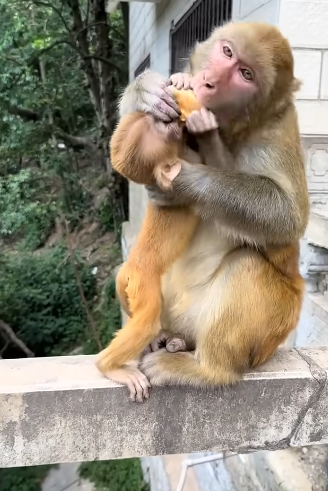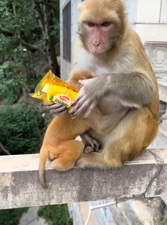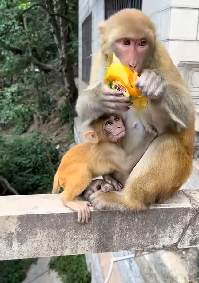 The young monkey’s eyes lit up, and it began to eat happily. Her baby looked at her with wide eyes, as if learning a new lesson: sharing feels good.