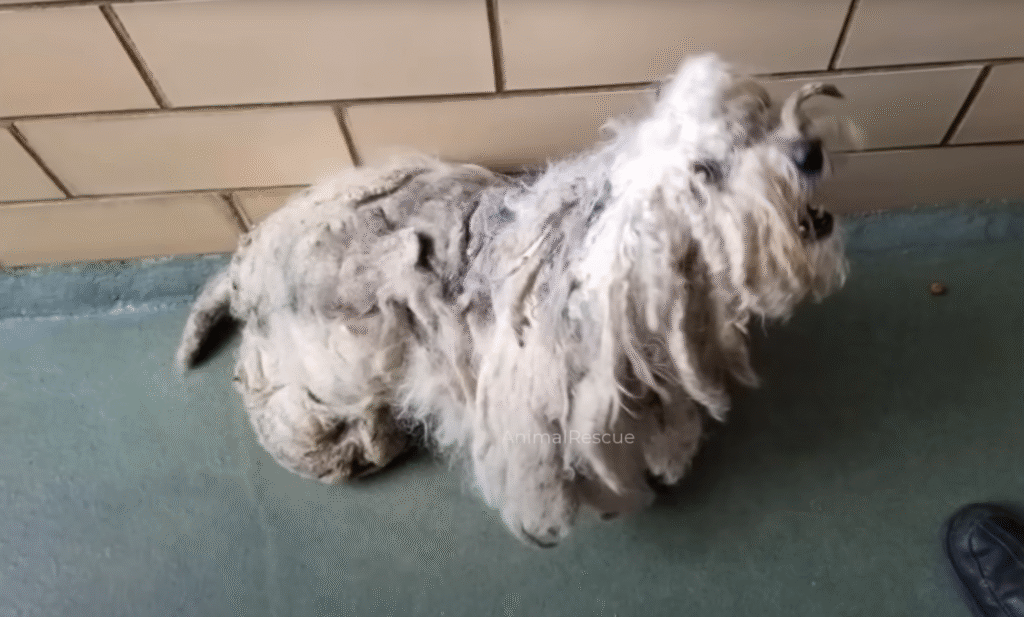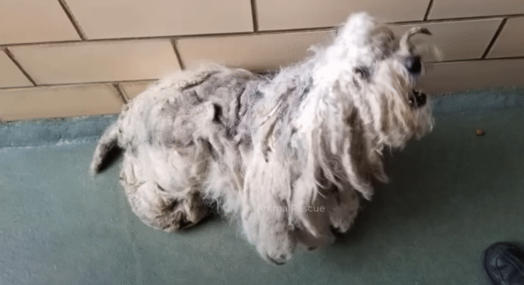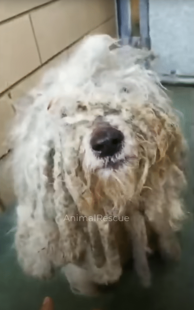 There, cowering in the shade, was a dog — or rather, a shadow of what a dog should have been. He was small, perhaps young, though it was hard to tell beneath layers of matted, filthy fur that clung to his frame in grotesque clumps. Dirt and grime coated him like a second skin, and his body trembled violently with every noise, every movement, every step I took closer. His eyes peeked through tangled hair, wide with terror, reflecting a profound mistrust of everything around him.
