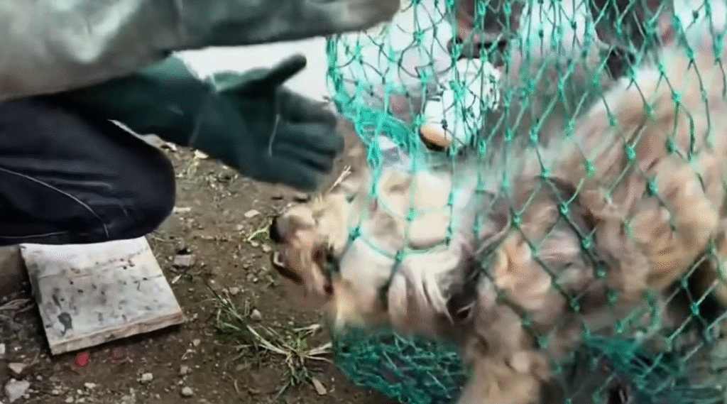 He was a dog, though it took me a moment to process the state he was in. His front paw was caught in a cruel steel trap, rusty and sharp-edged, digging painfully into his flesh. His fur was matted and dirty, streaked with dried blood, and his eyes, wide with terror, met mine as I approached. For two long months, this poor creature had been trapped, abandoned, and left to suffer, hidden from the world that had turned its back.