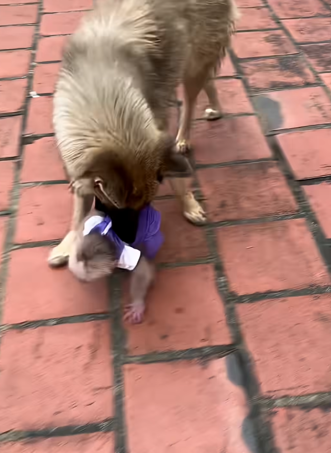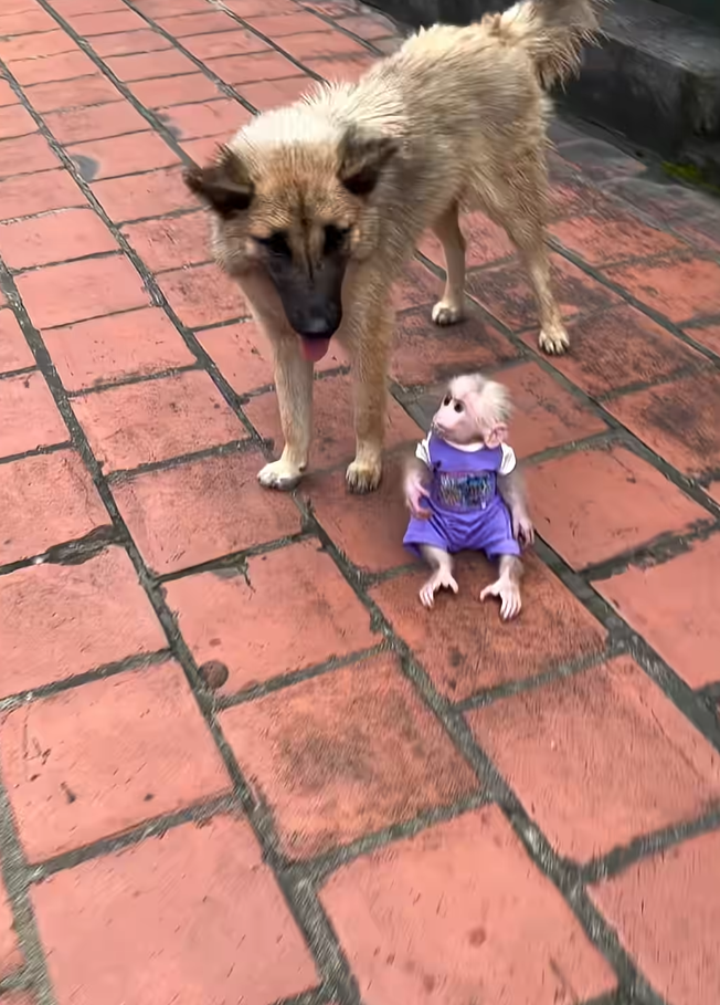 Lucky gave a soft “woof,” almost as if he agreed. His tail thumped gently against the ground, brushing against the monkeys.