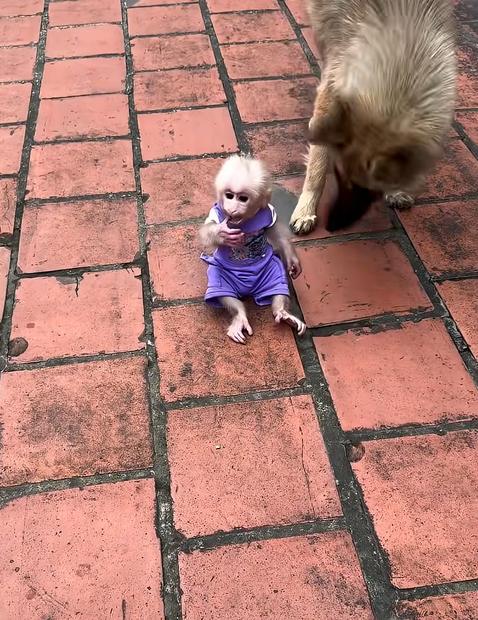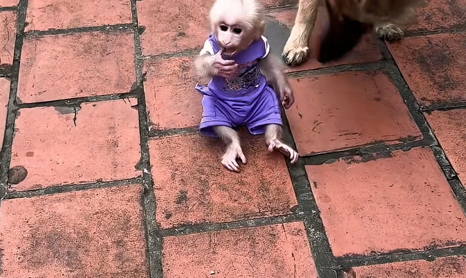 The afternoon sun streamed gently through the tall branches of the trees, filling the little clearing with a warm golden light. Kevin, the baby monkey, sat on a flat rock near the garden, his bright eyes fixed on the family dog who was lazily lying in the shade. The dog’s big brown ears twitched every so often as flies buzzed around, and his tail gave a slow wag now and then. Kevin tilted his head, fascinated by every little move.