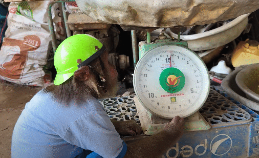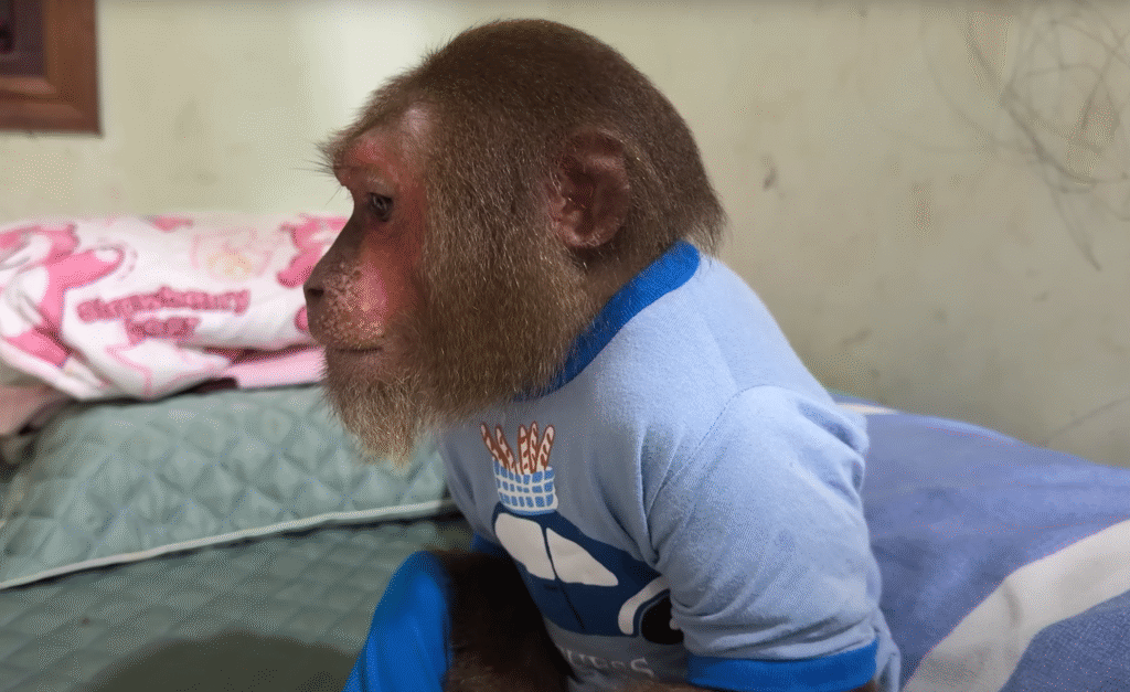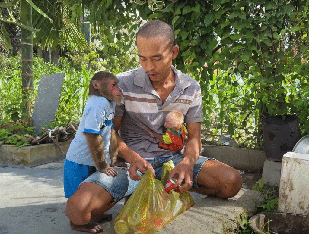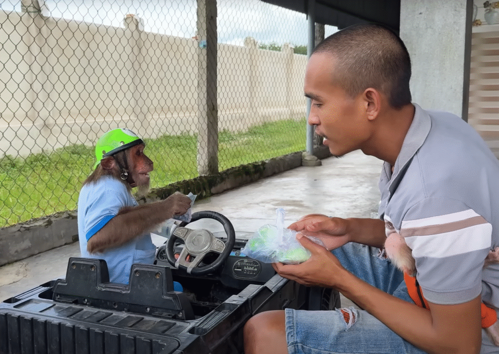 The baby monkey mirrored her, clasping his little hands together and squeaking dramatically, as if begging in his own language. He even dropped to his knees and bowed, which made Dad laugh so hard he had to set his tools down.