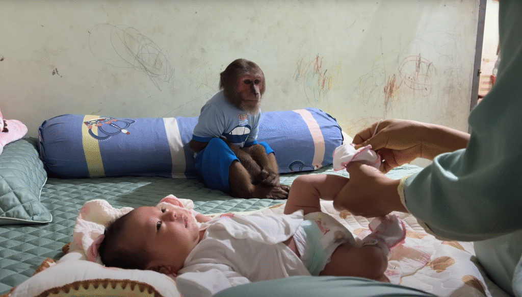 But neither CUTIS nor the monkey could contain their excitement. From the moment the newborn had arrived, they felt a huge responsibility. They wanted to help, to show Mom and Dad that they werenât just playful kids or mischievous animals. They wanted to prove they could be responsible and helpful too.