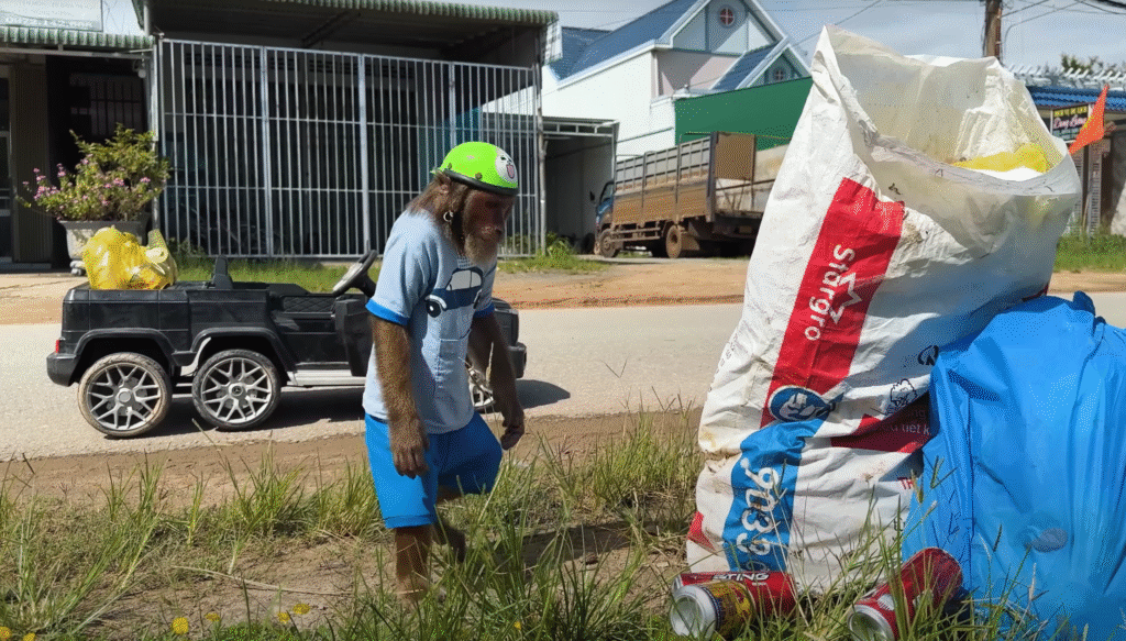 That morning, after a quick breakfast, CUTIS and the baby monkey ran to Dad, who was busy in the yard fixing a wooden shelf. His hands were dusty, his shirt damp with sweat, but his calm presence made him the center of strength for the family.