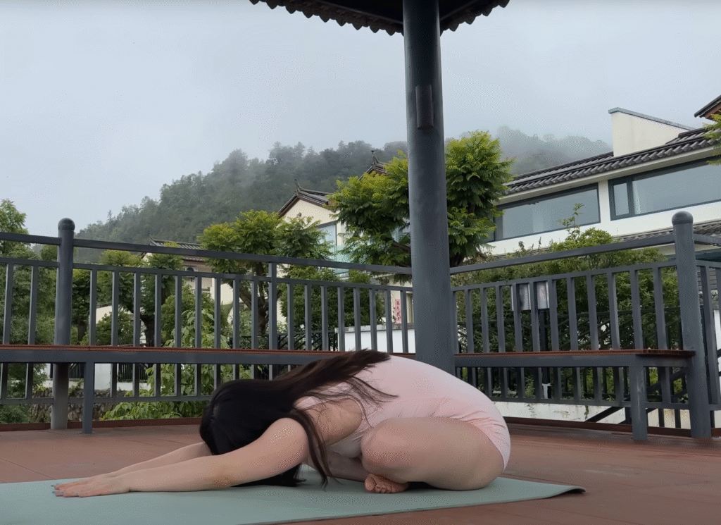 This flow begins not with movement, but with presence. Too often, we rush into stretches or postures without pausing to notice where we are in the moment. In the rainy setting, with the sound of droplets as a kind of natural ASMR, the first step is to close the eyes and simply breathe. Sitting tall on the mat, one hand rests on the heart and the other on the belly. Inhale deeply, letting the ribcage expand, then exhale slowly, imagining the tension leaving the spine, shoulders, and mind. The breath becomes a bridge between the body’s discomfort and its healing.
