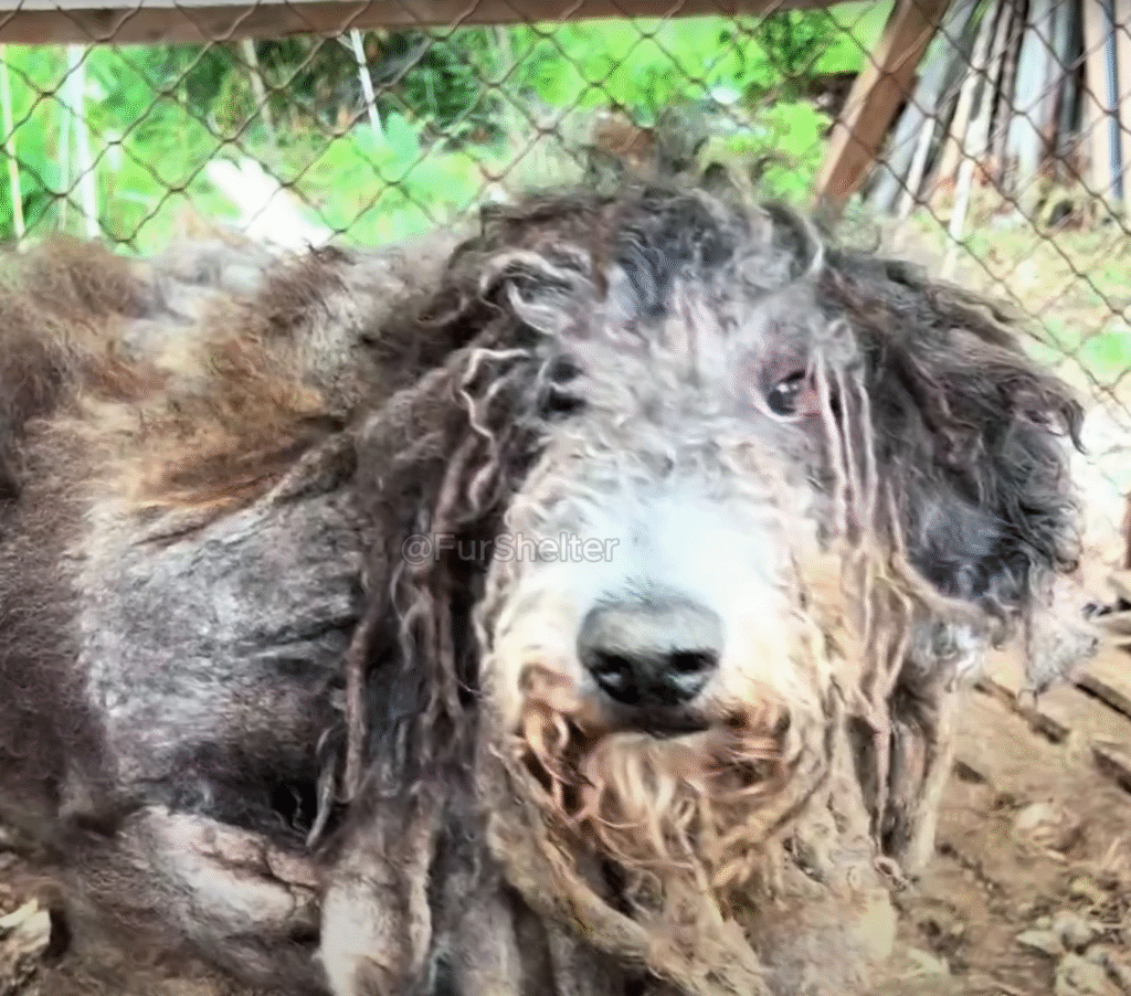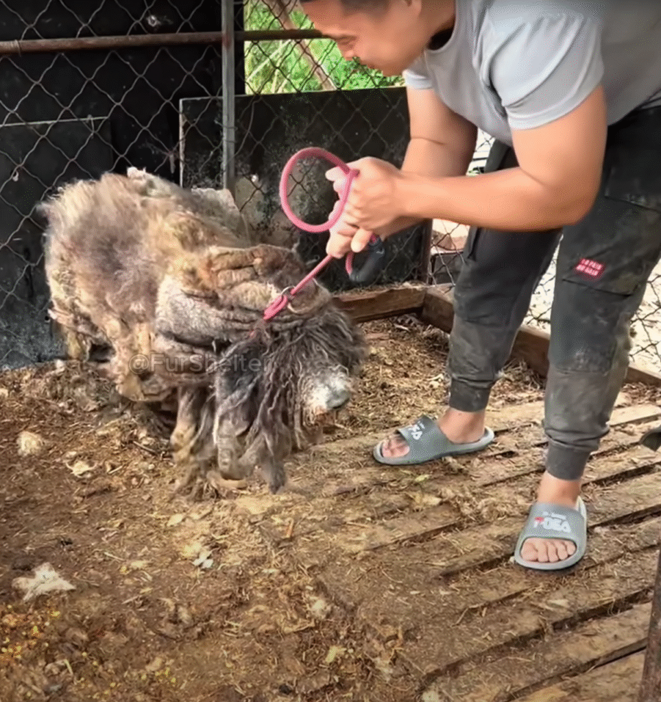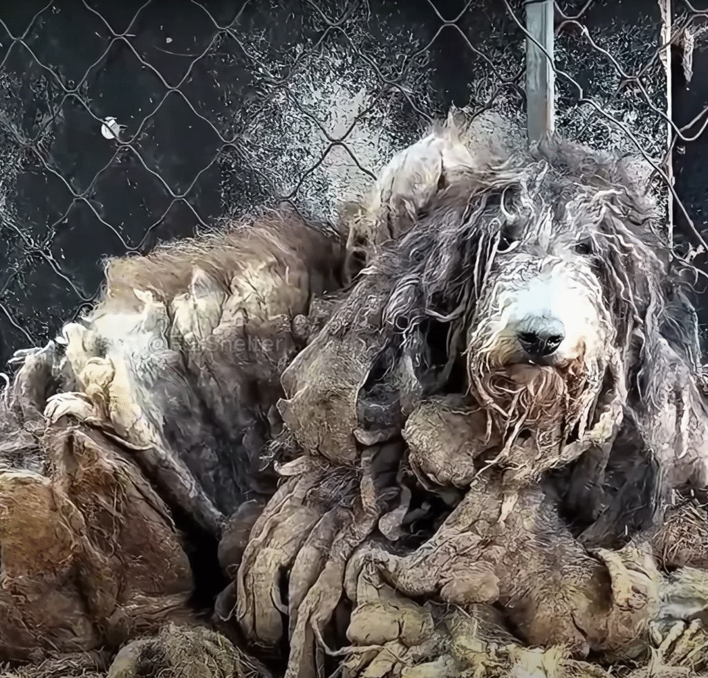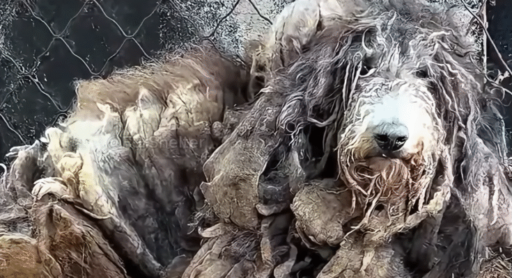 Four years. Four long, endless years. That’s how long Rocky had spent locked in a tiny, rusty cage in the corner of a dilapidated backyard, hidden behind overgrown weeds and forgotten by the humans who had once promised to love him. His fur, once a golden shade of sunshine, had dulled to a grimy brown, tangled and matted from neglect. His eyes, filled with a spark of life as a puppy, had grown hollow, clouded by years of hunger, loneliness, and despair. Rocky had known warmth, but for the better part of four years, all he had known was suffering.