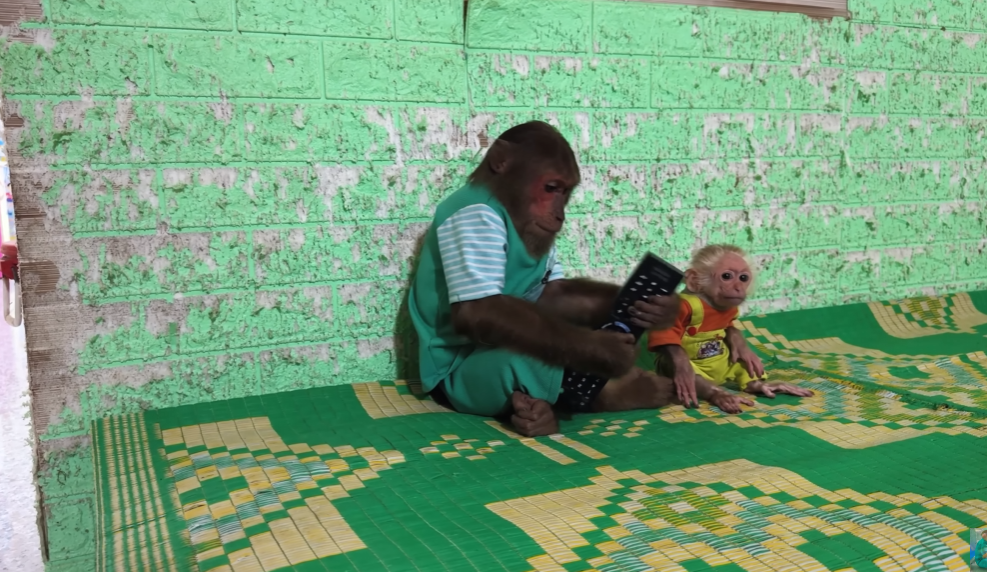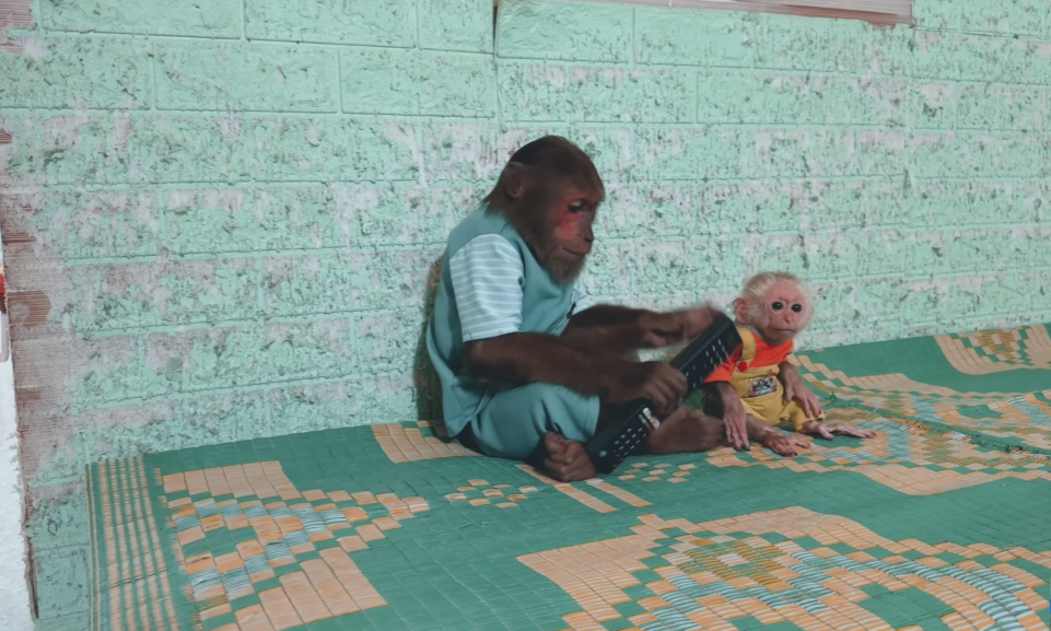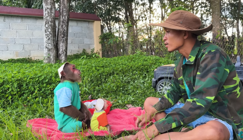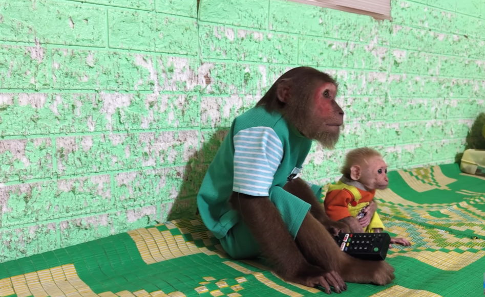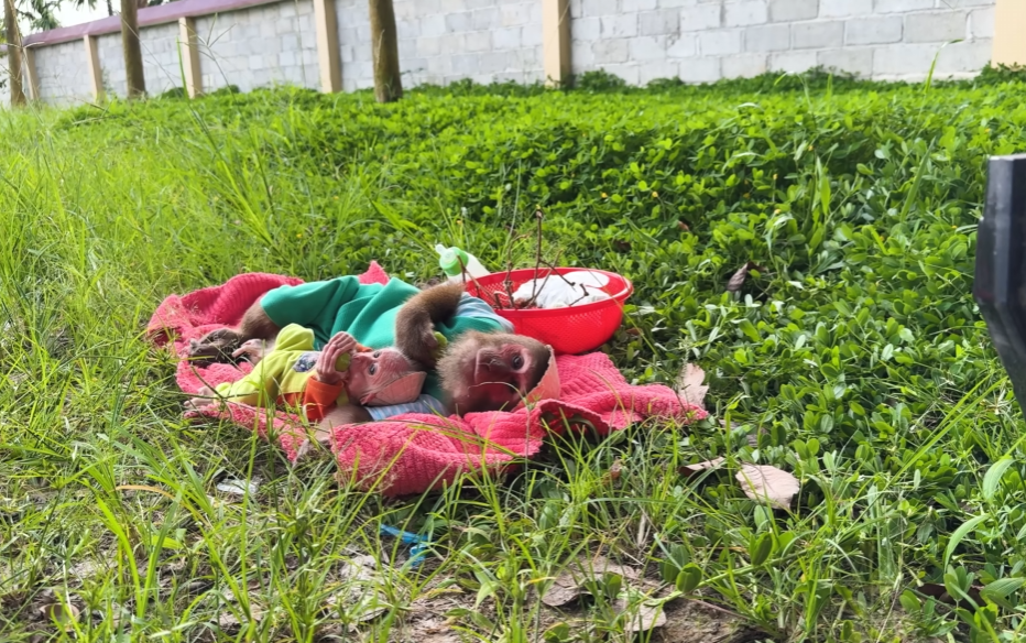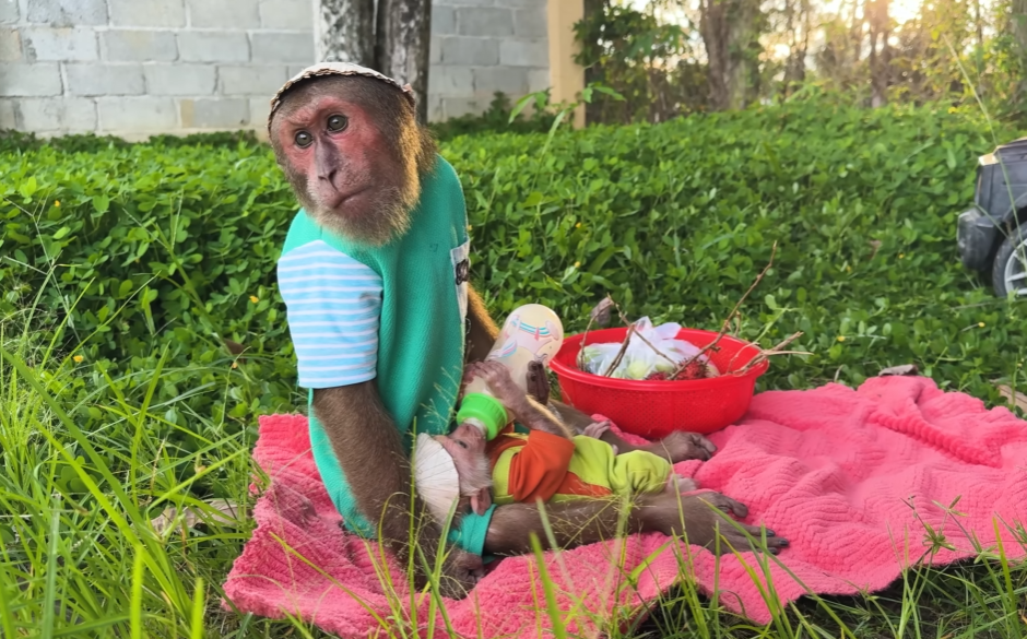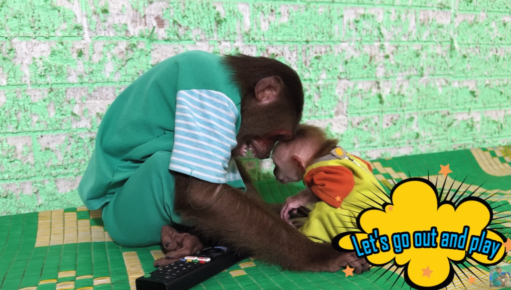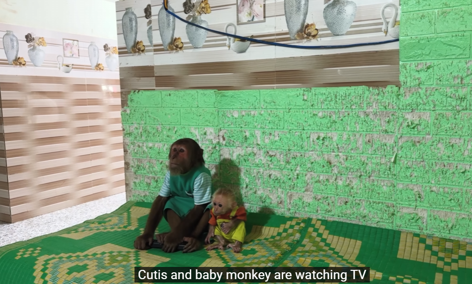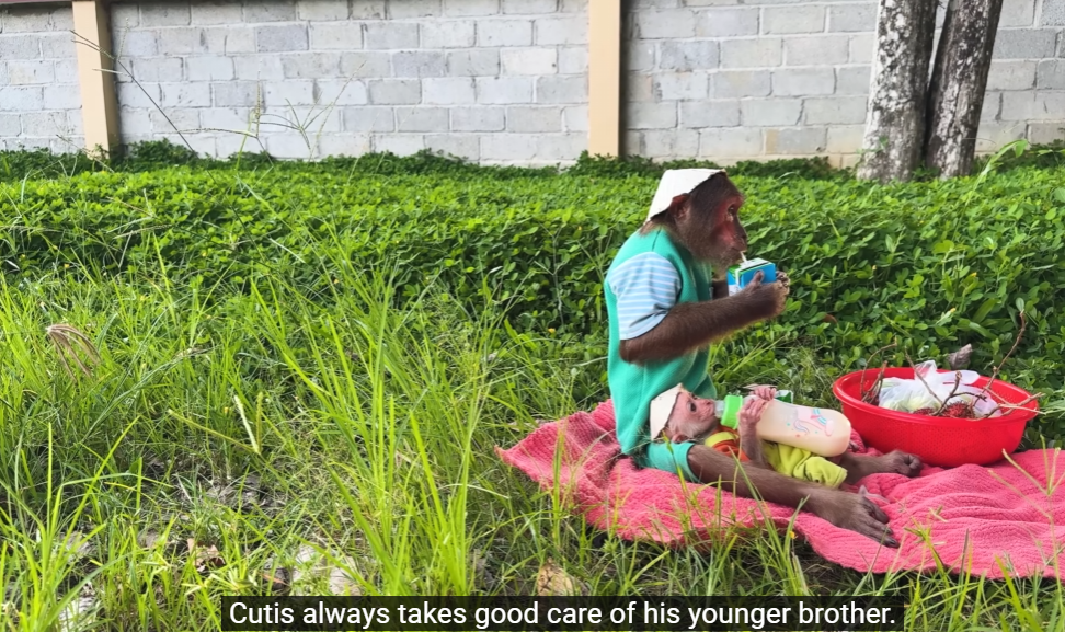 Whenever flies or insects buzzed near Lina, the monkey would swipe at them with quick, playful hands, while CUTIS wagged his tail softly to fan the air and keep her cool. Sometimes, when Lina cried, CUTIS would nuzzle her gently, and the monkey would bring little flowers or leaves, trying to cheer her up.